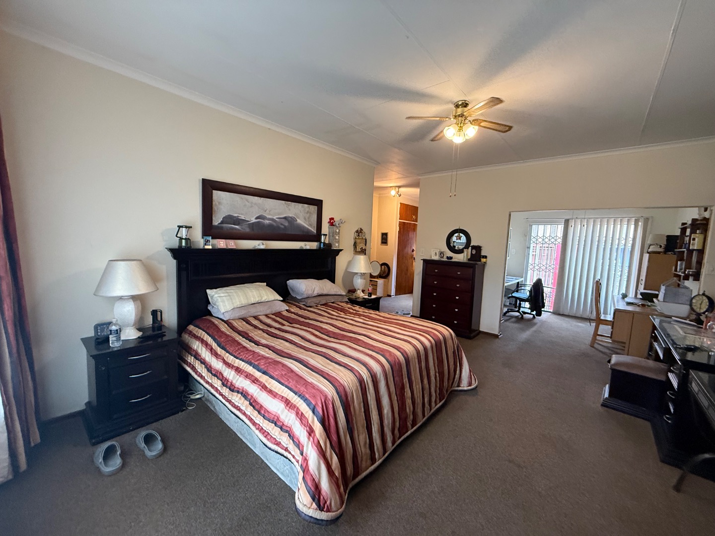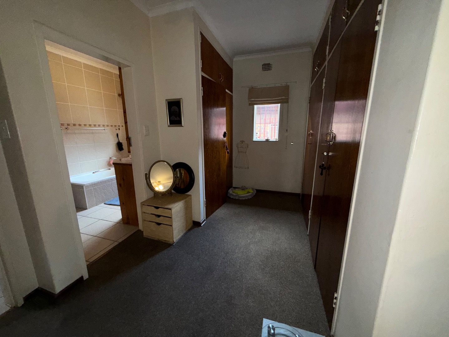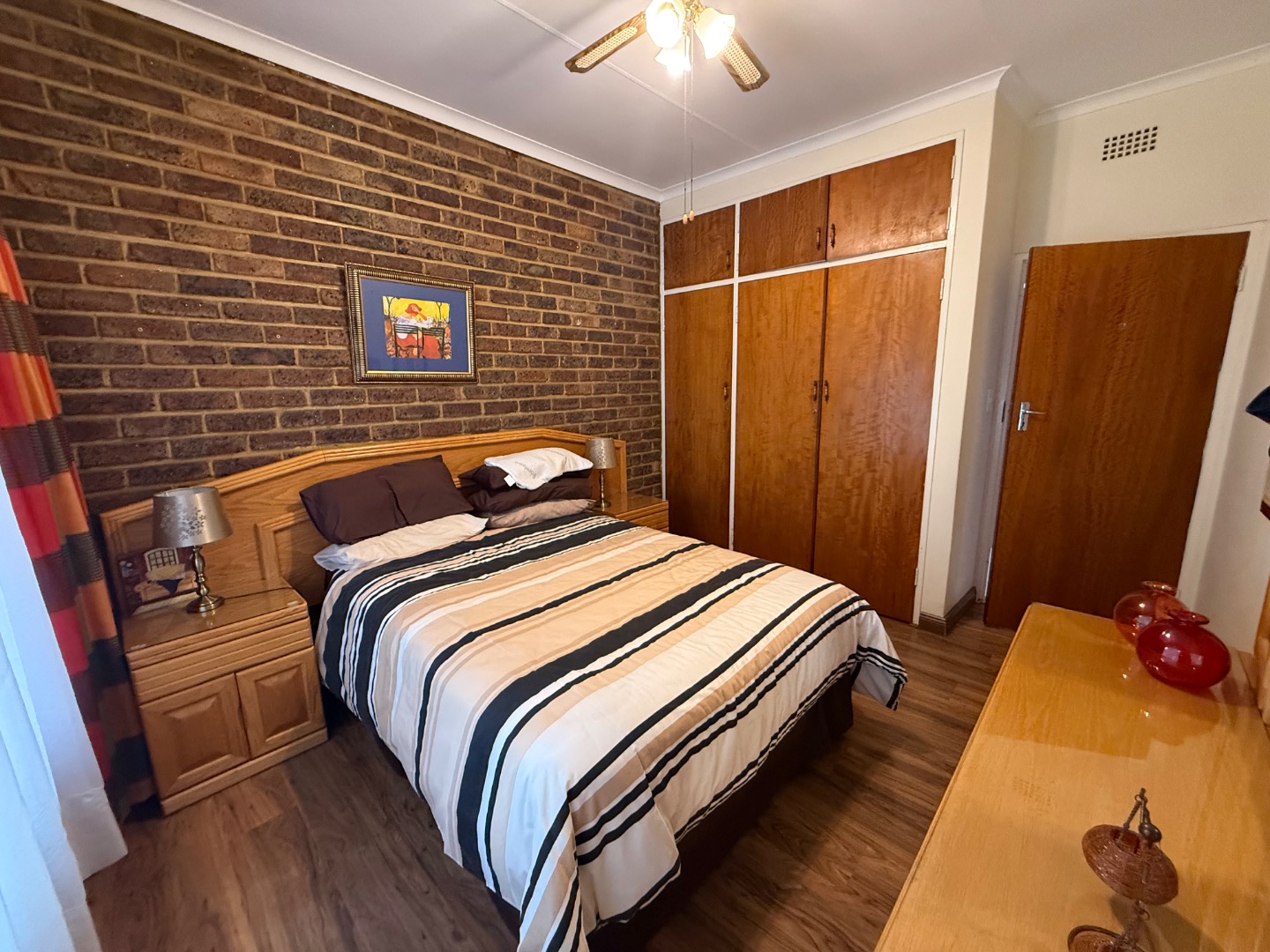 There are four spacious bedrooms in the main house. The main bedroom offers an en suite bathroom, ample cupboard space, and an added study with its own private entrance, leading directly to the swimming pool. A second bathroom services the remaining bedrooms.