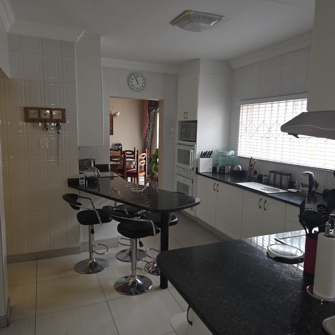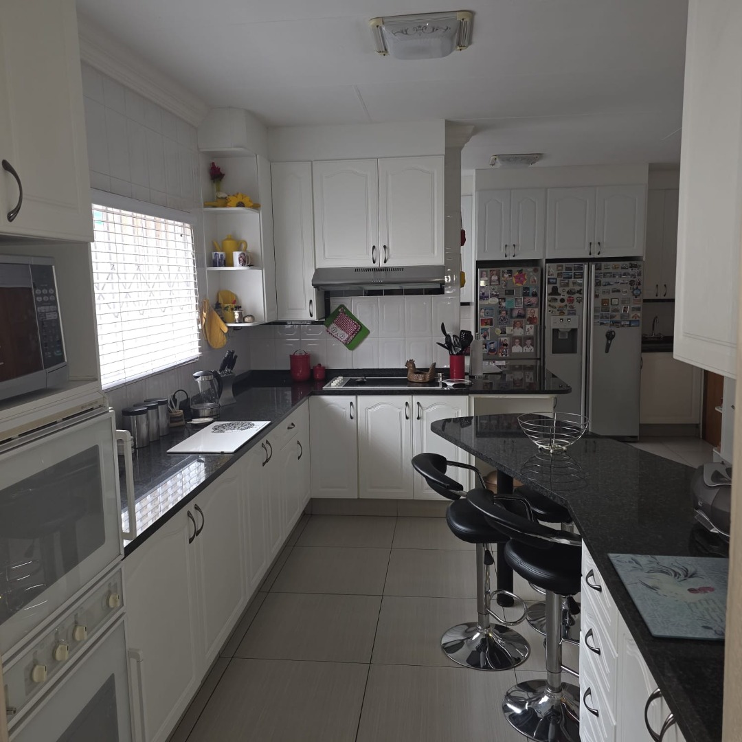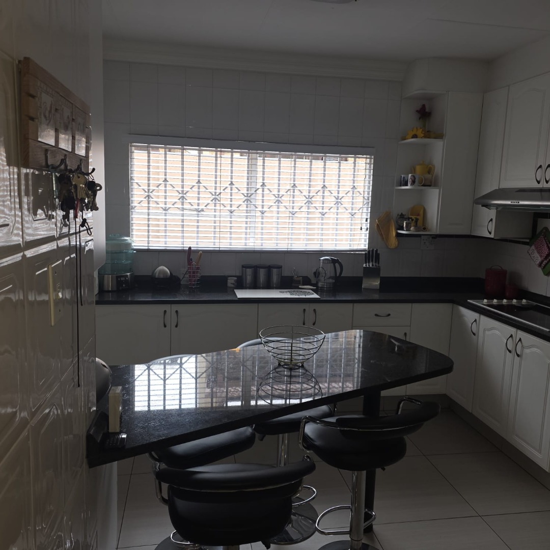 The spacious dining room connects effortlessly to the modern black-and-white kitchen, fitted with black granite countertops, a breakfast nook, generous cupboard space, a walk-in pantry, and a separate scullery and laundry area.