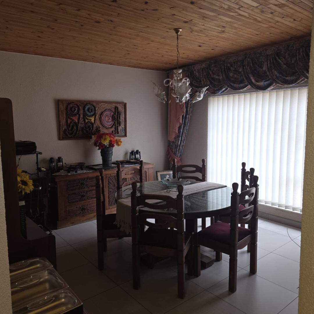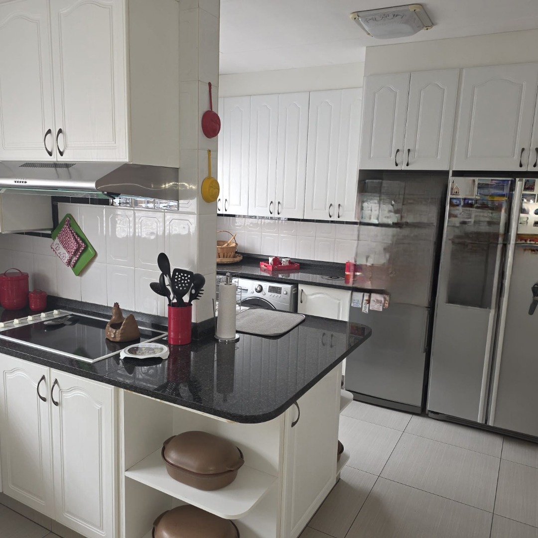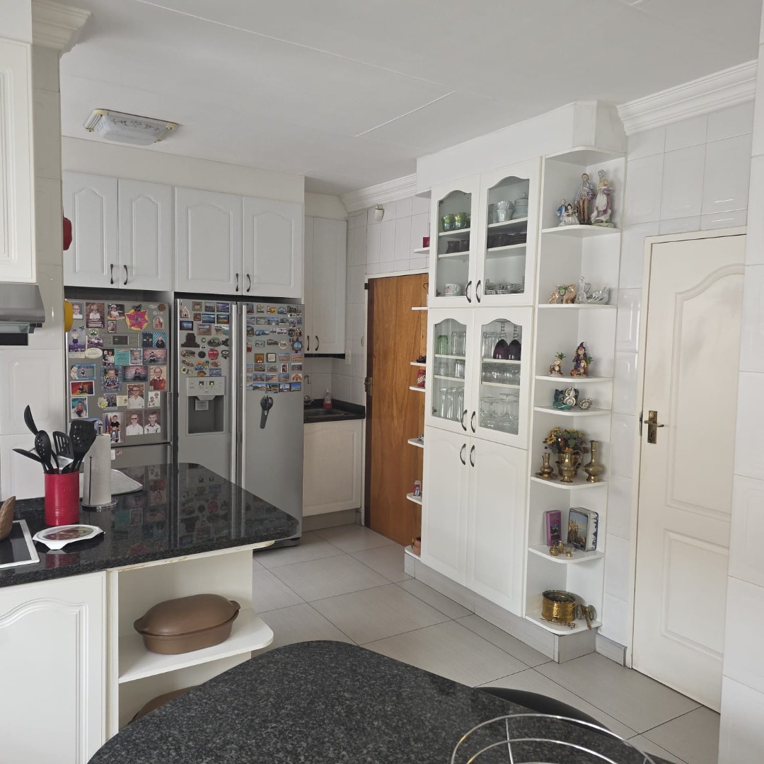 The spacious dining room connects effortlessly to the modern black-and-white kitchen, fitted with black granite countertops, a breakfast nook, generous cupboard space, a walk-in pantry, and a separate scullery and laundry area.