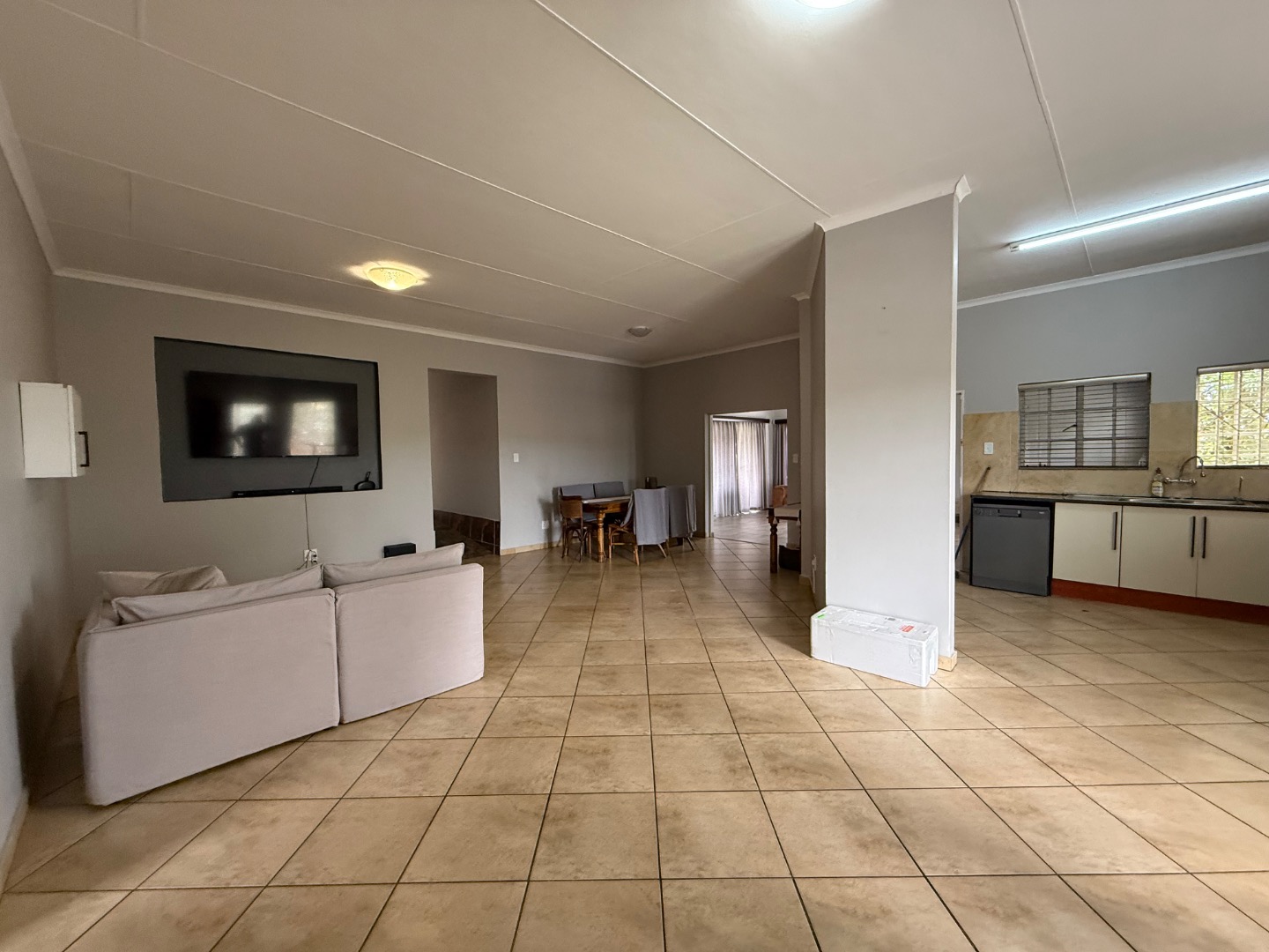 The home features a spacious open-plan kitchen, lounge, and dining area, complemented by a separate TV lounge that leads out to a well-maintained garden with a boma area—perfect for entertaining.