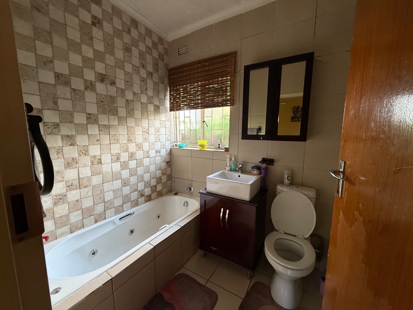 Accommodation comprises four well-proportioned bedrooms, each offering a private retreat. The master bedroom benefits from an en-suite bathroom, while a second bathroom serves the remaining rooms. Bedrooms feature durable laminate wood flooring and enjoy natural light, complemented by security bars on windows. One bathroom boasts a jetted bathtub, while the other includes a compact corner shower.