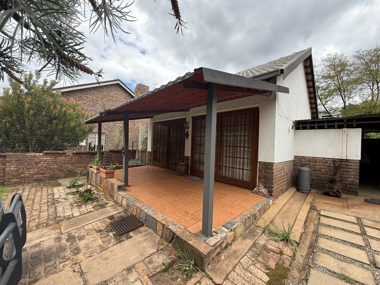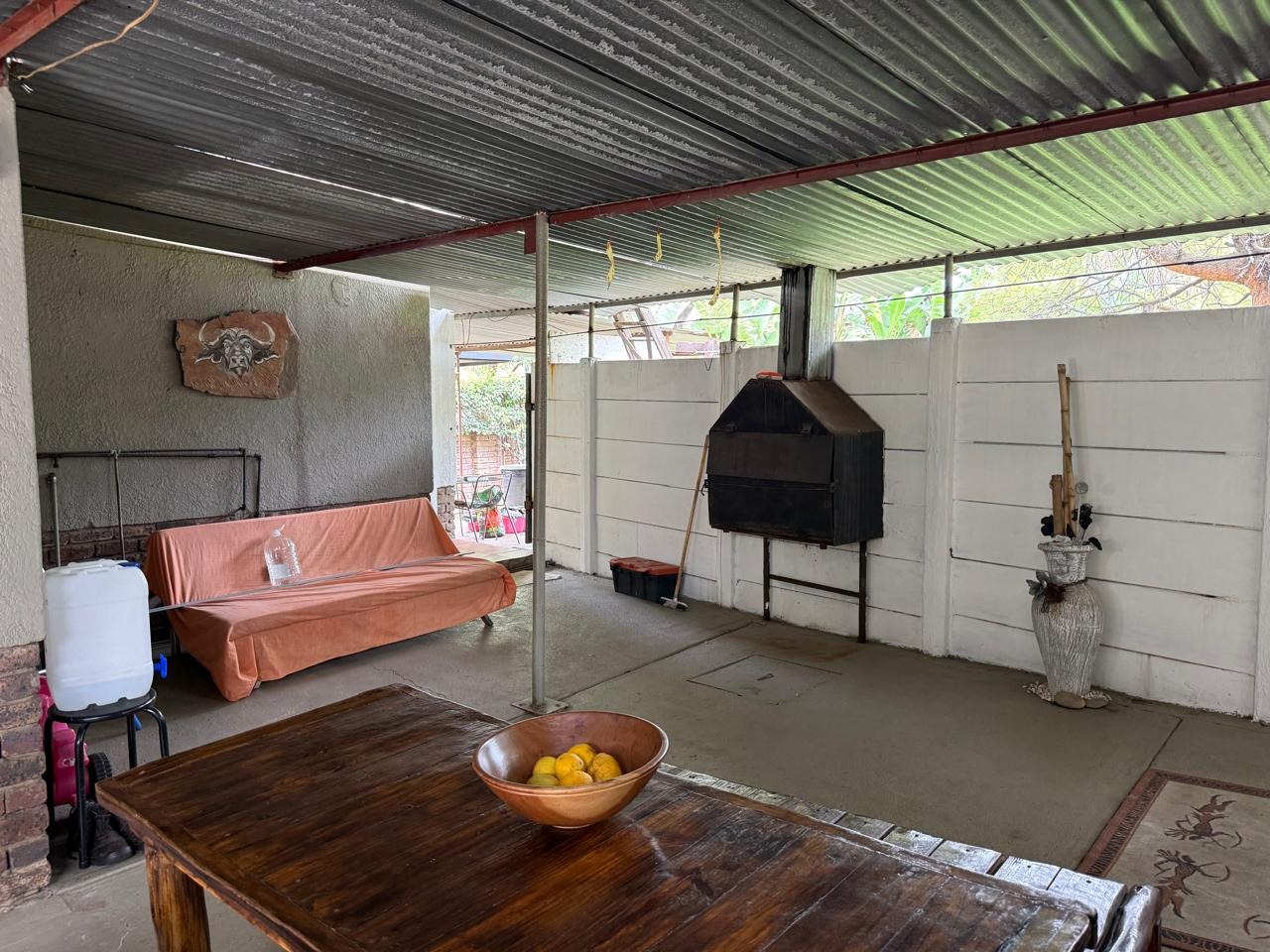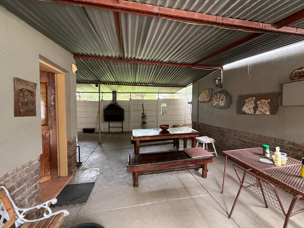 A covered braai area overlooks a neat, well-maintained garden, perfect for outdoor enjoyment.