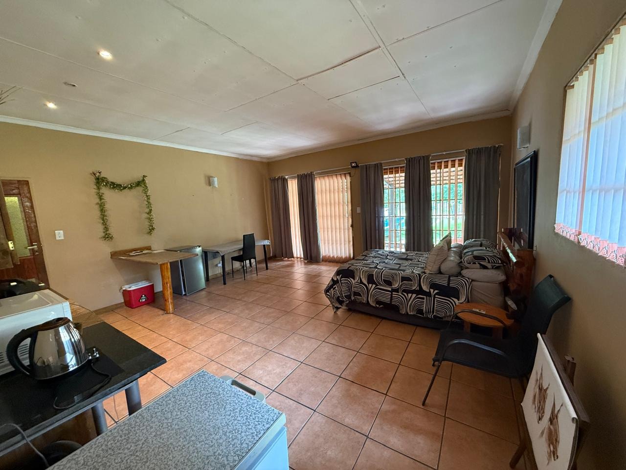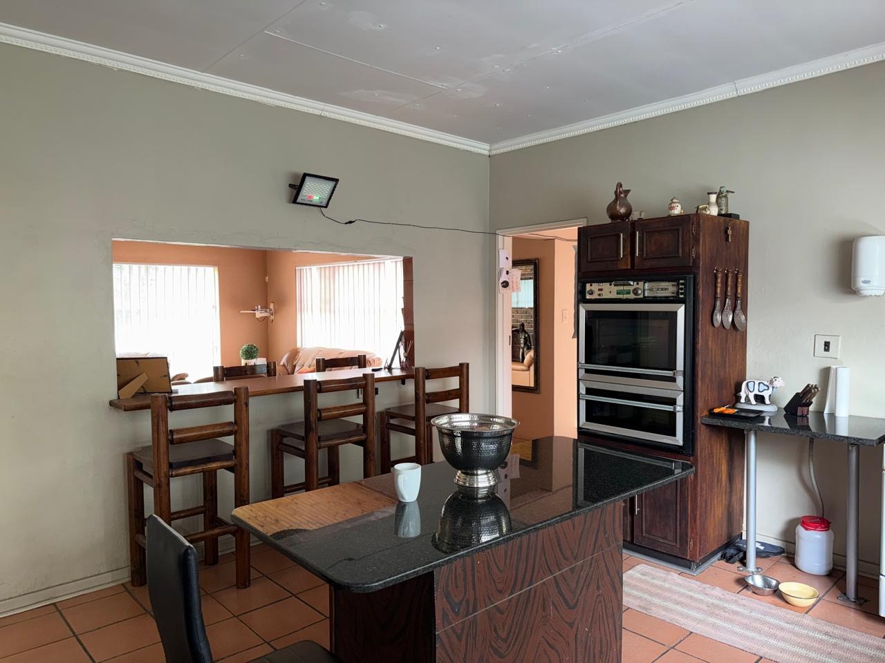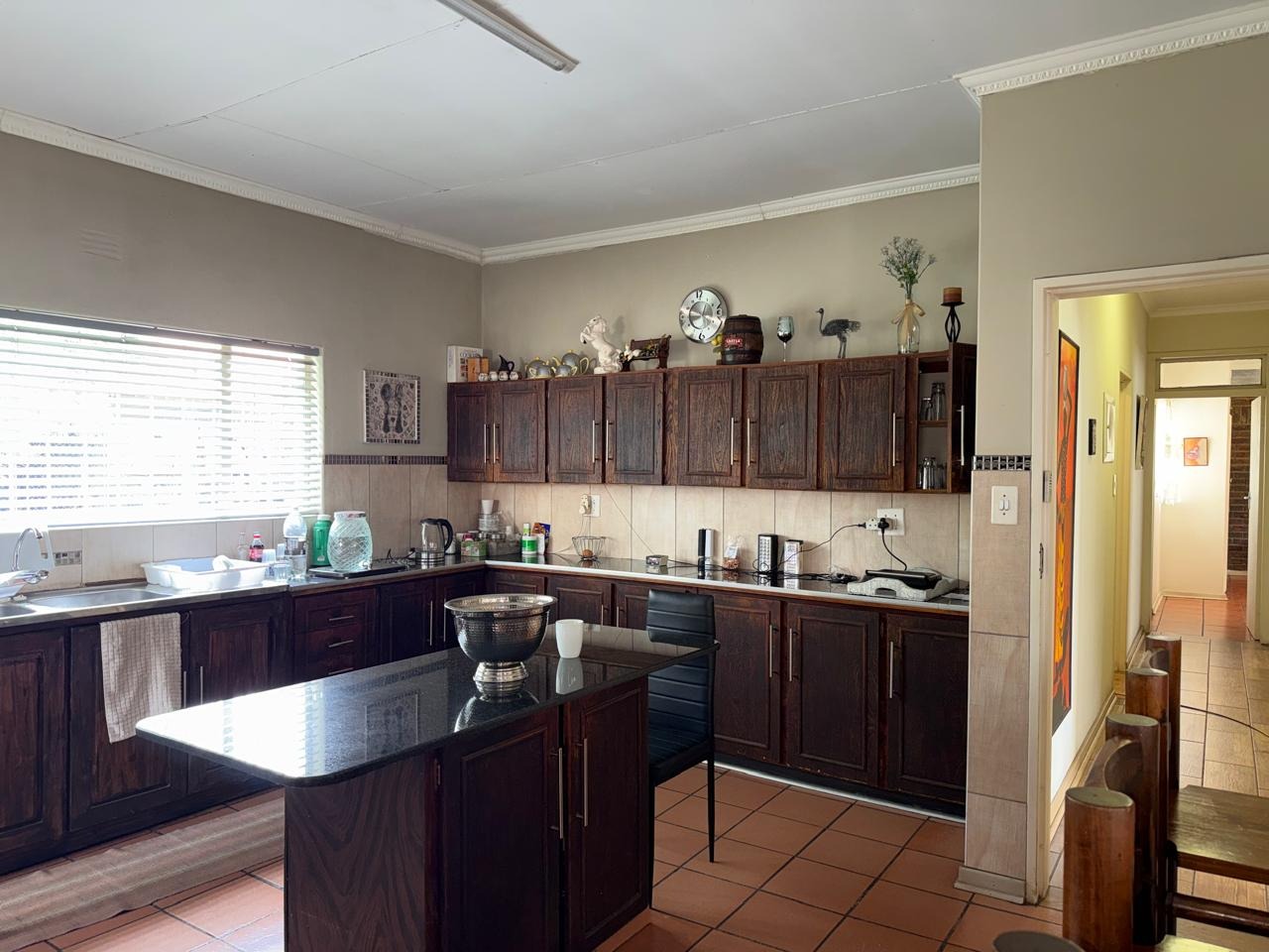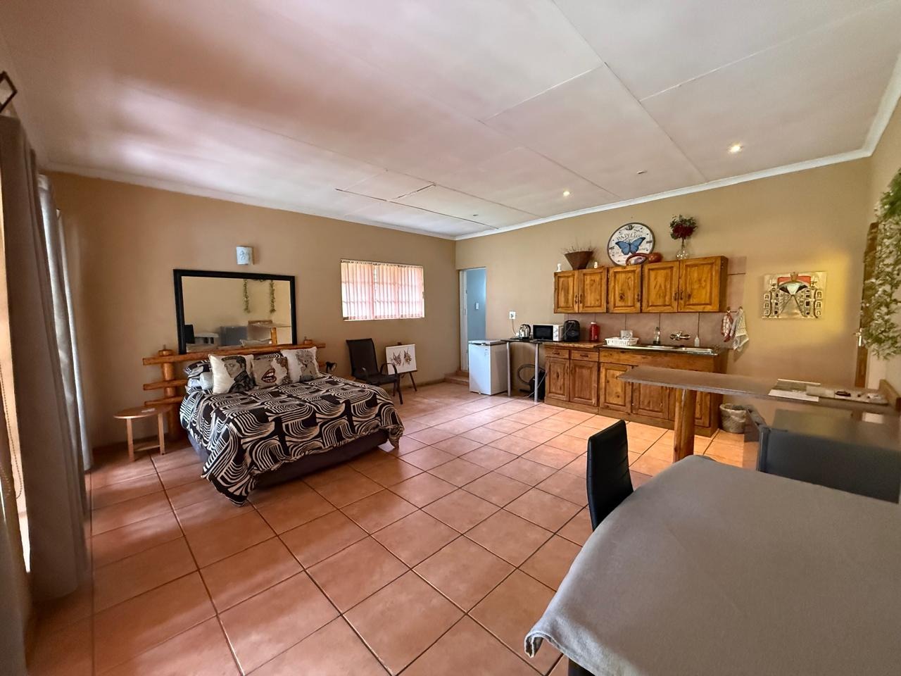 The main house features three tiled bedrooms, all fitted with built-in cupboards. The home is fully tiled throughout and boasts a modern open-plan kitchen, dining room, and lounge, creating a seamless flow ideal for family living and entertaining.