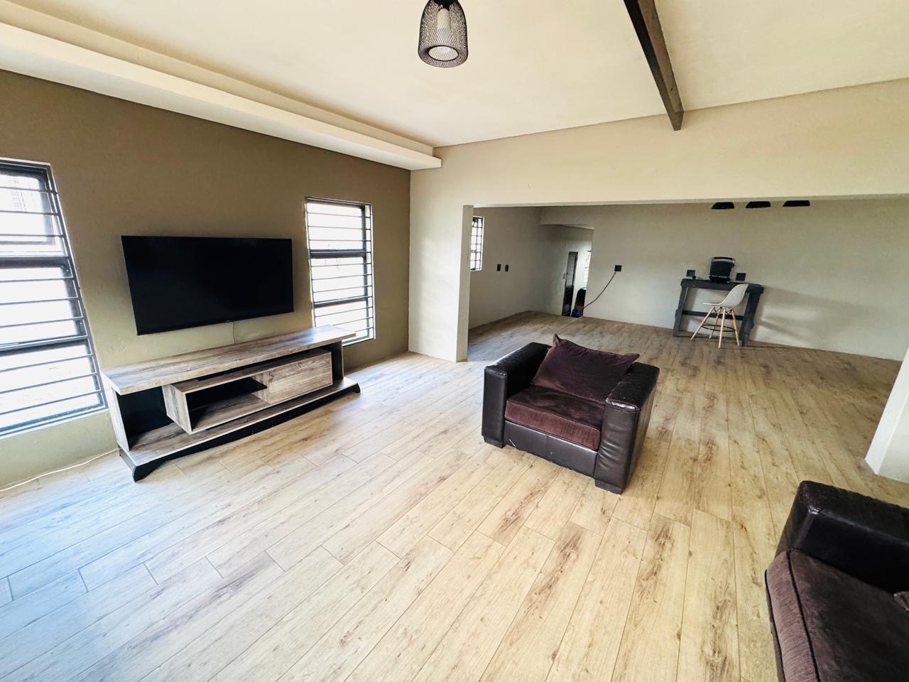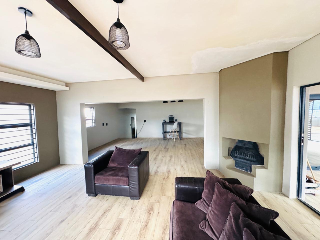 The layout includes a formal lounge, a TV lounge, and an open-plan kitchen area, all designed to flow seamlessly onto a large patio featuring a built-in braai—ideal for entertaining and enjoying relaxed indoor–outdoor living.