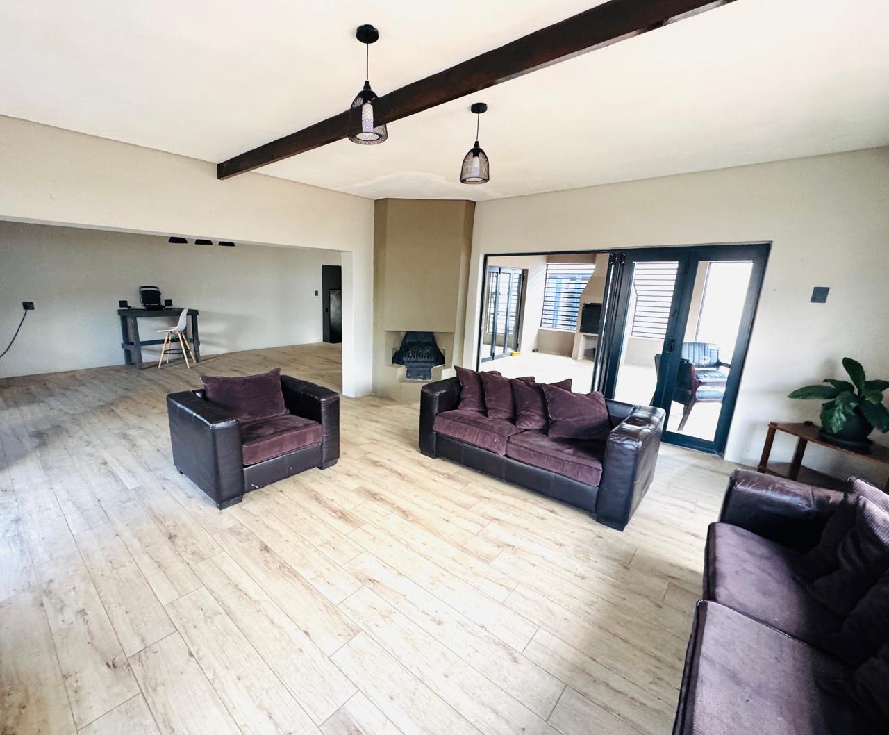 The layout includes a formal lounge, a TV lounge, and an open-plan kitchen area, all designed to flow seamlessly onto a large patio featuring a built-in braai—ideal for entertaining and enjoying relaxed indoor–outdoor living.