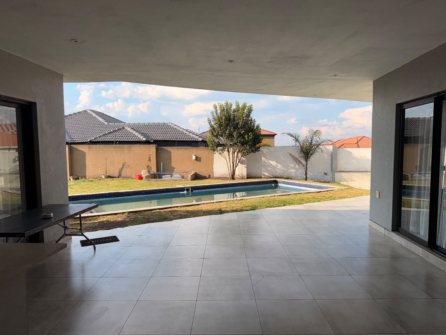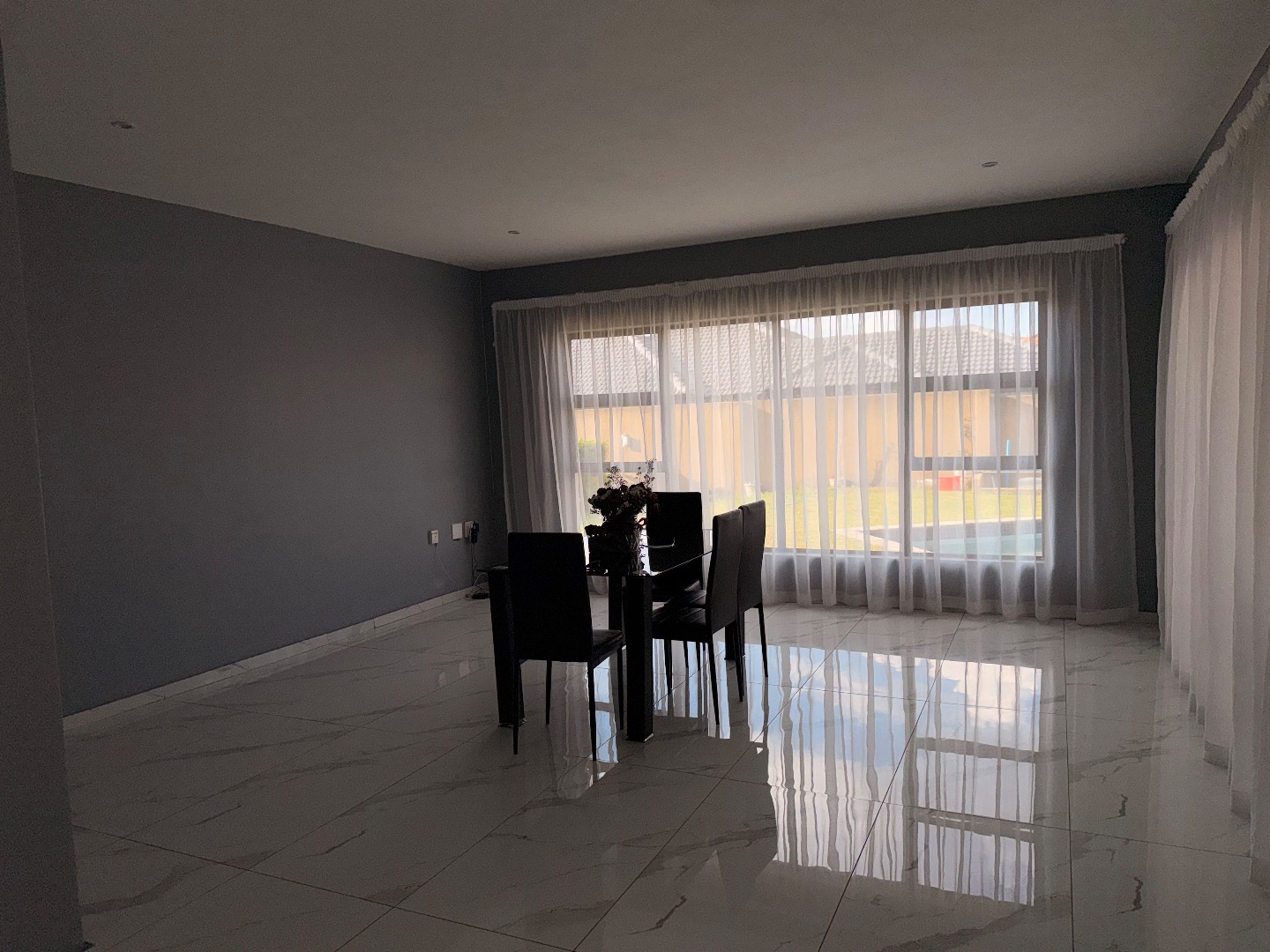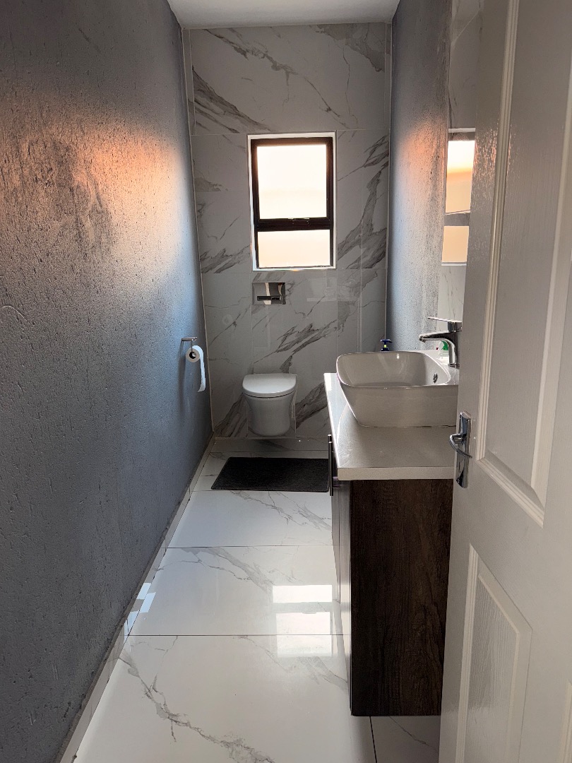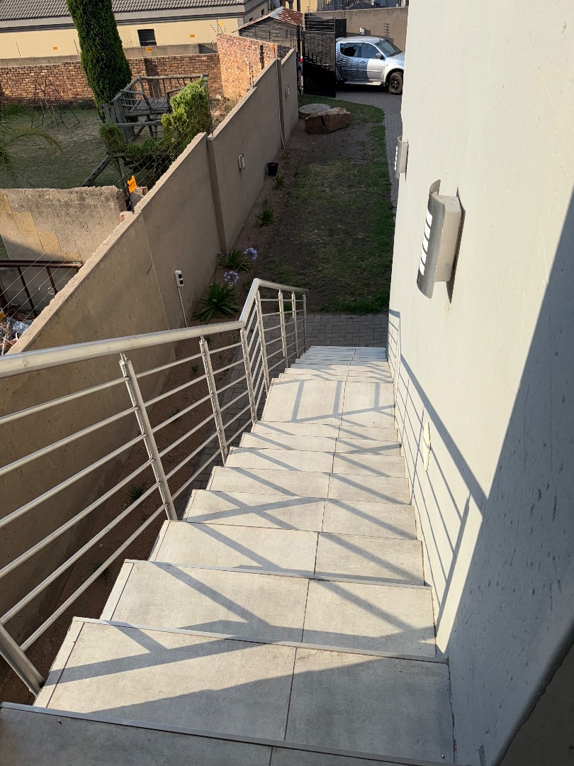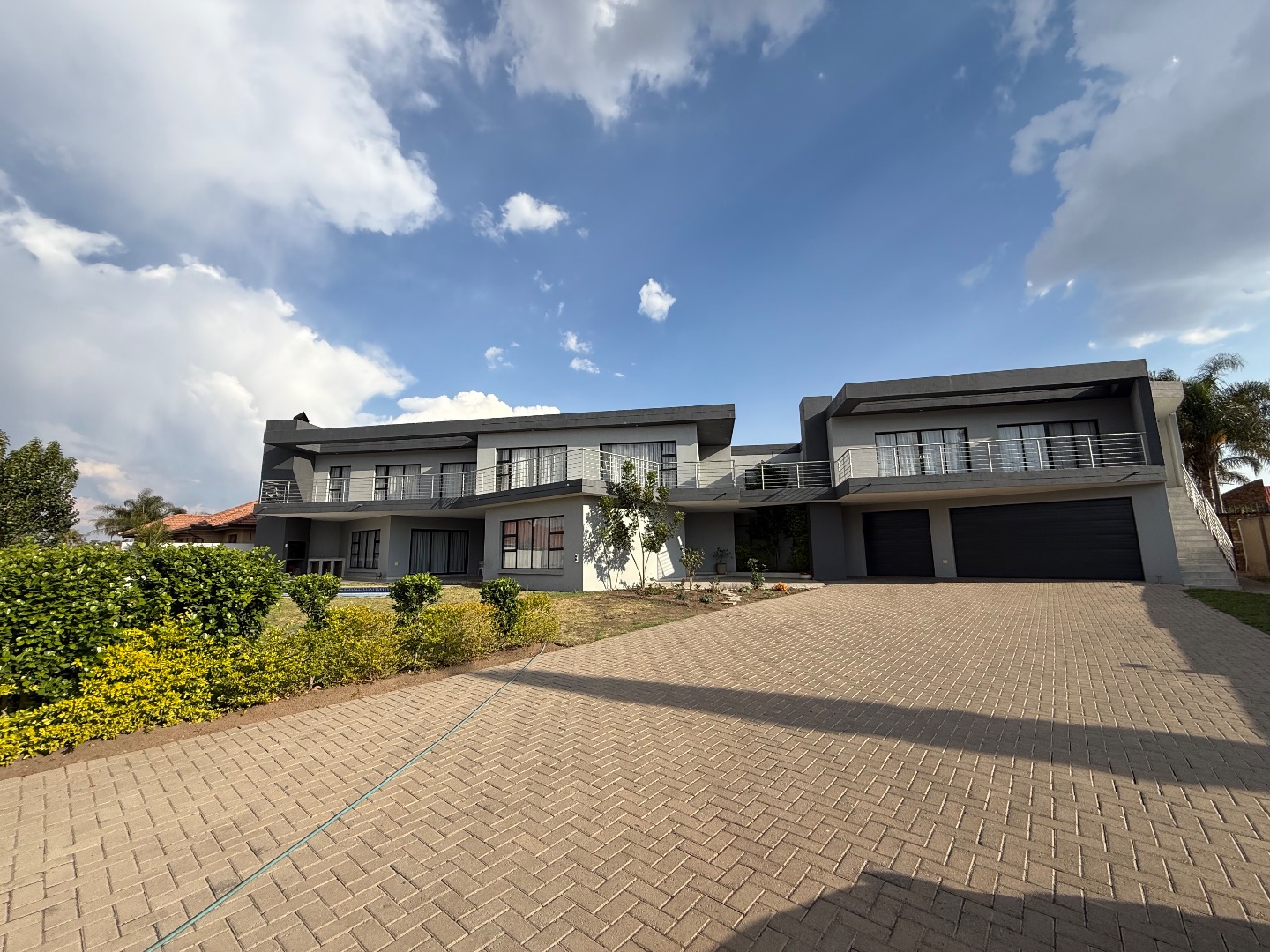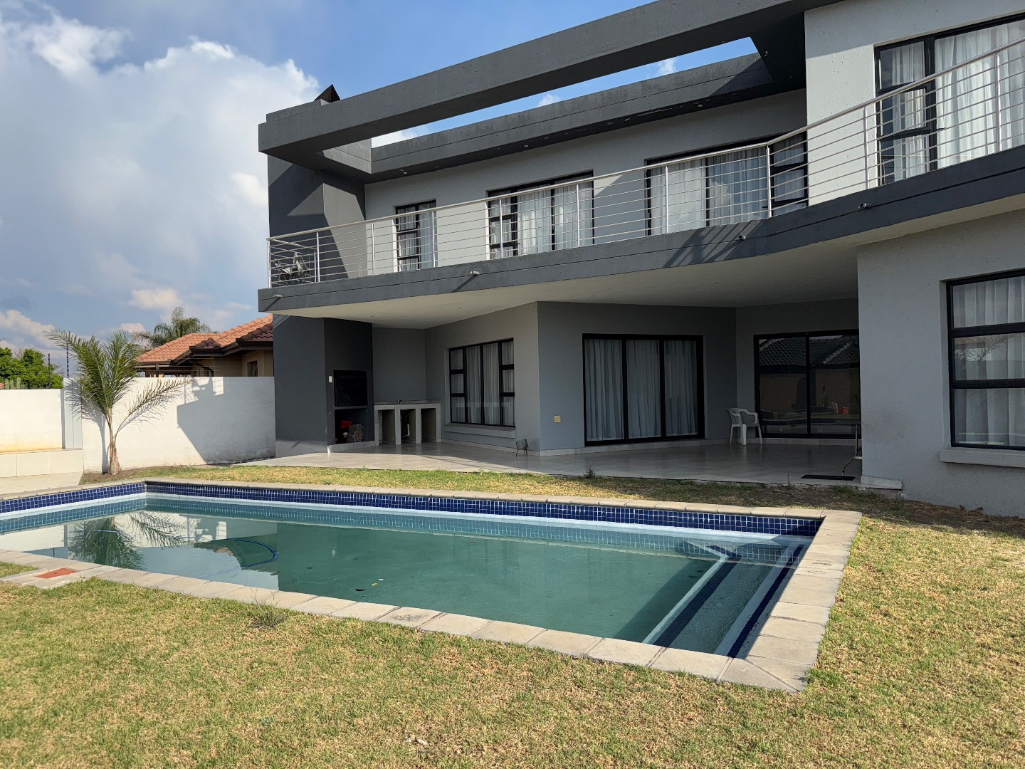Discover this exceptional modern residence located in the desirable Model Park, Witbank, South Africa. Boasting a sleek grey exterior, contemporary flat roofs, and clean architectural lines, this property immediately impresses with its kerb appeal and expansive presence. Large windows and glass doors throughout ensure an abundance of natural light, creating a bright and inviting atmosphere. The interior spans a generous 724.00 sqm, offering an open-plan design that seamlessly connects multiple living spaces. The home features four distinct lounges, including a dedicated family TV room, alongside two elegant dining rooms and a well-appointed kitchen. High ceilings, modern large-format tile flooring, and a striking staircase with marble-look tiles and stainless steel railings underscore the property's sophisticated aesthetic. Comfort is paramount with seven spacious bedrooms, four of which are en-suite, providing private sanctuaries for all occupants. A convenient guest toilet and a dedicated laundry area further enhance the home's functionality, catering to the needs of a large family or those who enjoy hosting. Outdoor living is a highlight, set on a substantial 1447.00 sqm erf. The property features a private swimming pool, perfect for relaxation and entertainment. Multiple balconies offer elevated outdoor retreats, complementing the covered ground-floor patio equipped with a built-in braai and an additional tiled entertainment area with built-in seating and a fire pit. A well-maintained garden, paving, and a spacious driveway lead to three integrated garages, ensuring ample parking and storage. Security is comprehensively addressed with a perimeter fence, electric fencing, an access gate, and an alarm system, providing peace of mind. Modern conveniences include fibre connectivity and water tanks, ensuring a comfortable and connected lifestyle. Pets are welcome, making this a truly family-friendly home.