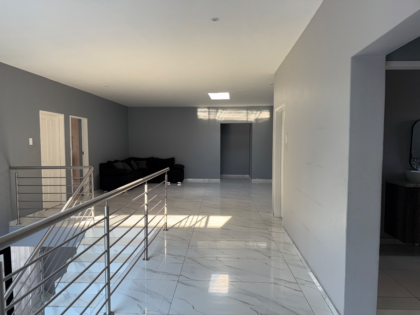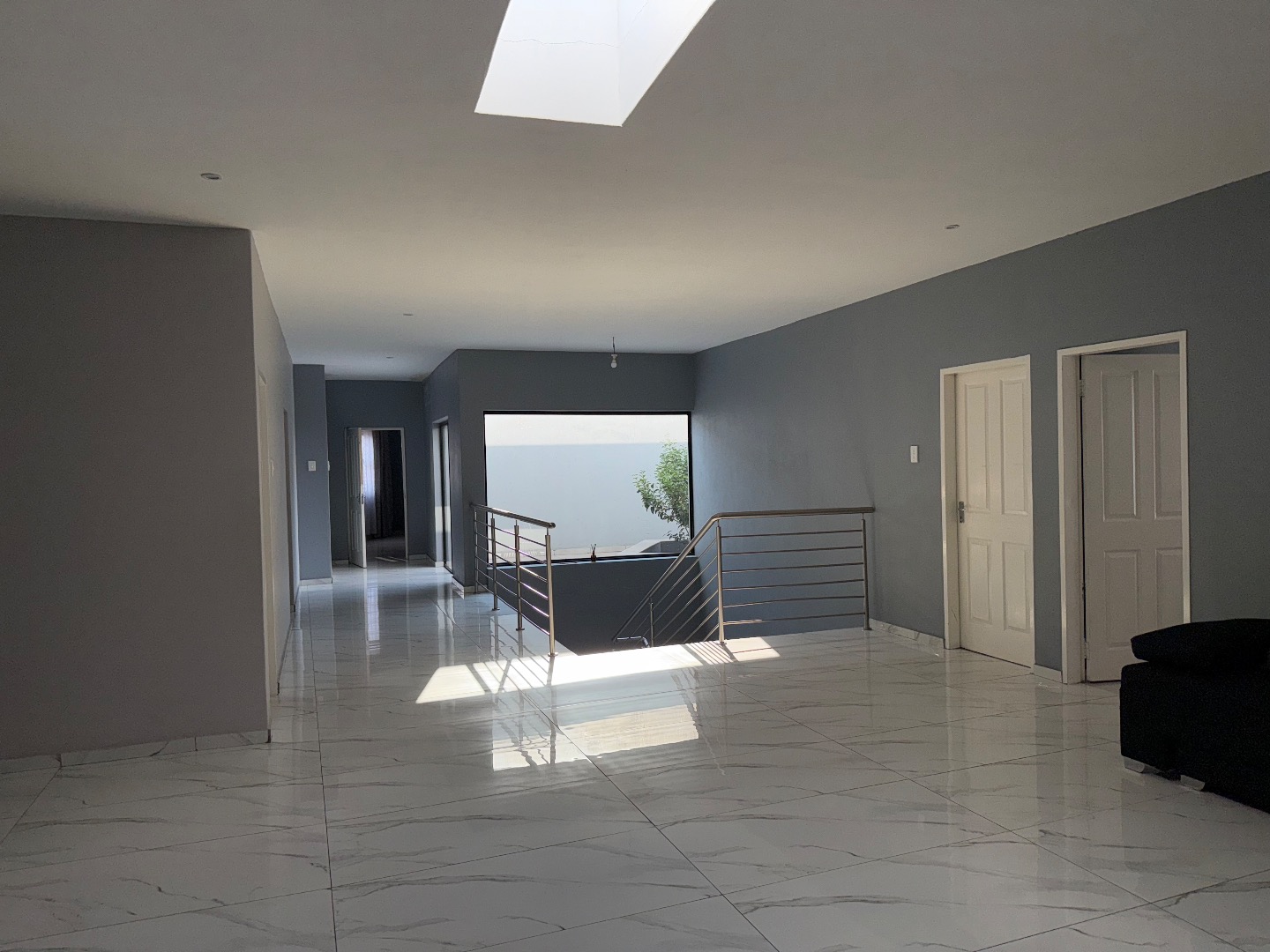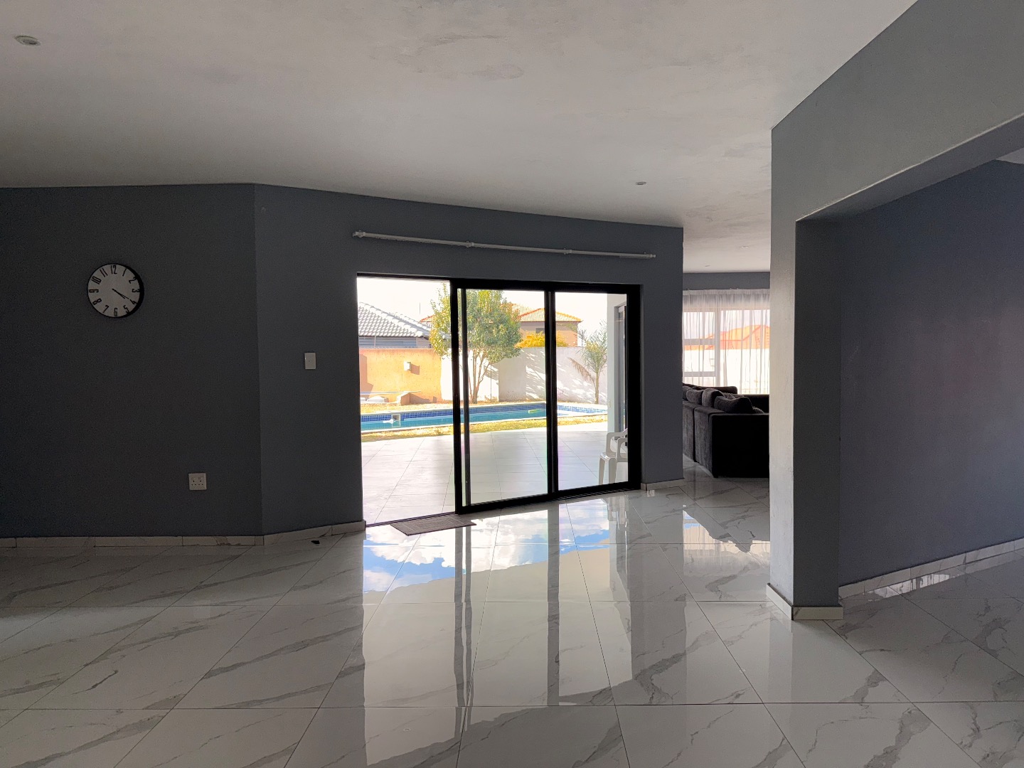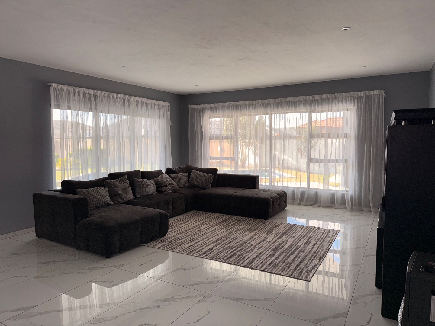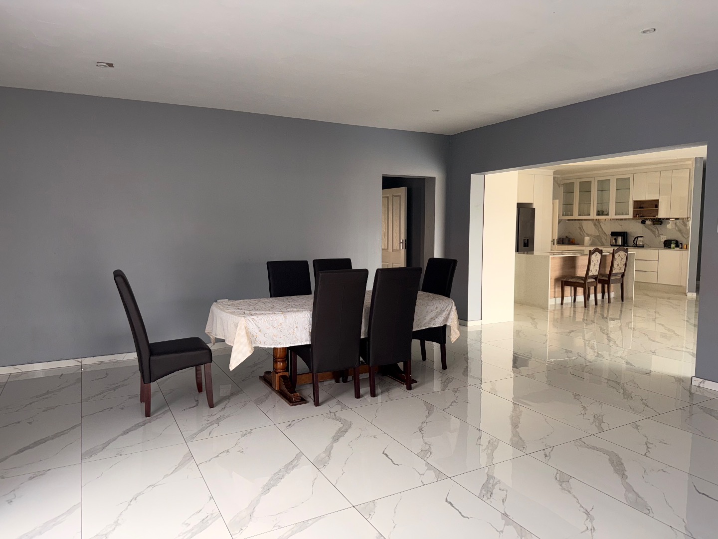 Discover this exceptional modern residence located in the desirable Model Park, Witbank, South Africa. Boasting a sleek grey exterior, contemporary flat roofs, and clean architectural lines, this property immediately impresses with its kerb appeal and expansive presence. Large windows and glass doors throughout ensure an abundance of natural light, creating a bright and inviting atmosphere. The interior spans a generous 724.00 sqm, offering an open-plan design that seamlessly connects multiple living spaces. The home features four distinct lounges, including a dedicated family TV room, alongside two elegant dining rooms and a well-appointed kitchen. High ceilings, modern large-format tile flooring, and a striking staircase with marble-look tiles and stainless steel railings underscore the property's sophisticated aesthetic. Comfort is paramount with seven spacious bedrooms, four of which are en-suite, providing private sanctuaries for all occupants. A convenient guest toilet and a dedicated laundry area further enhance the home's functionality, catering to the needs of a large family or those who enjoy hosting. Outdoor living is a highlight, set on a substantial 1447.00 sqm erf. The property features a private swimming pool, perfect for relaxation and entertainment. Multiple balconies offer elevated outdoor retreats, complementing the covered ground-floor patio equipped with a built-in braai and an additional tiled entertainment area with built-in seating and a fire pit. A well-maintained garden, paving, and a spacious driveway lead to three integrated garages, ensuring ample parking and storage. Security is comprehensively addressed with a perimeter fence, electric fencing, an access gate, and an alarm system, providing peace of mind. Modern conveniences include fibre connectivity and water tanks, ensuring a comfortable and connected lifestyle. Pets are welcome, making this a truly family-friendly home.