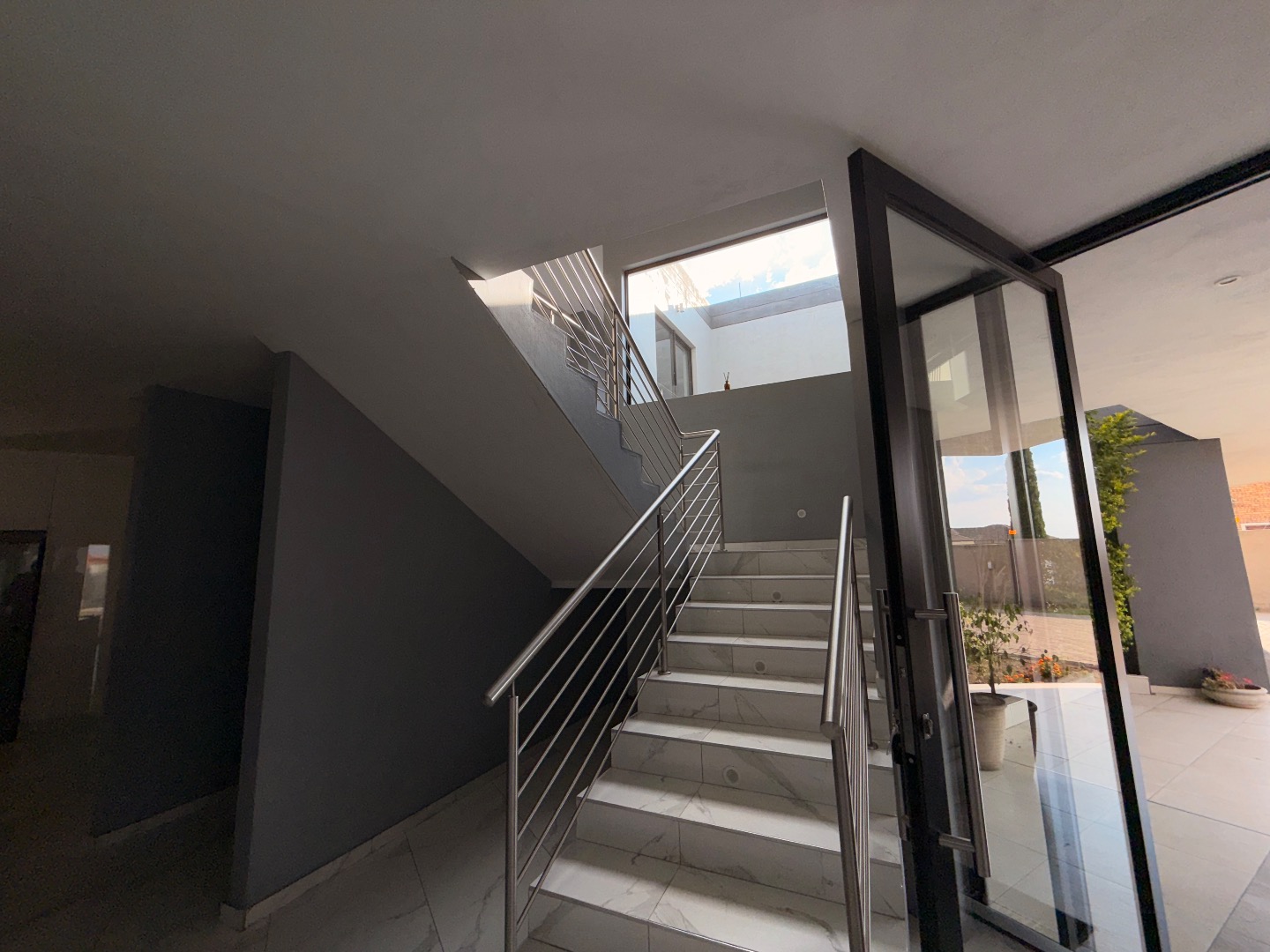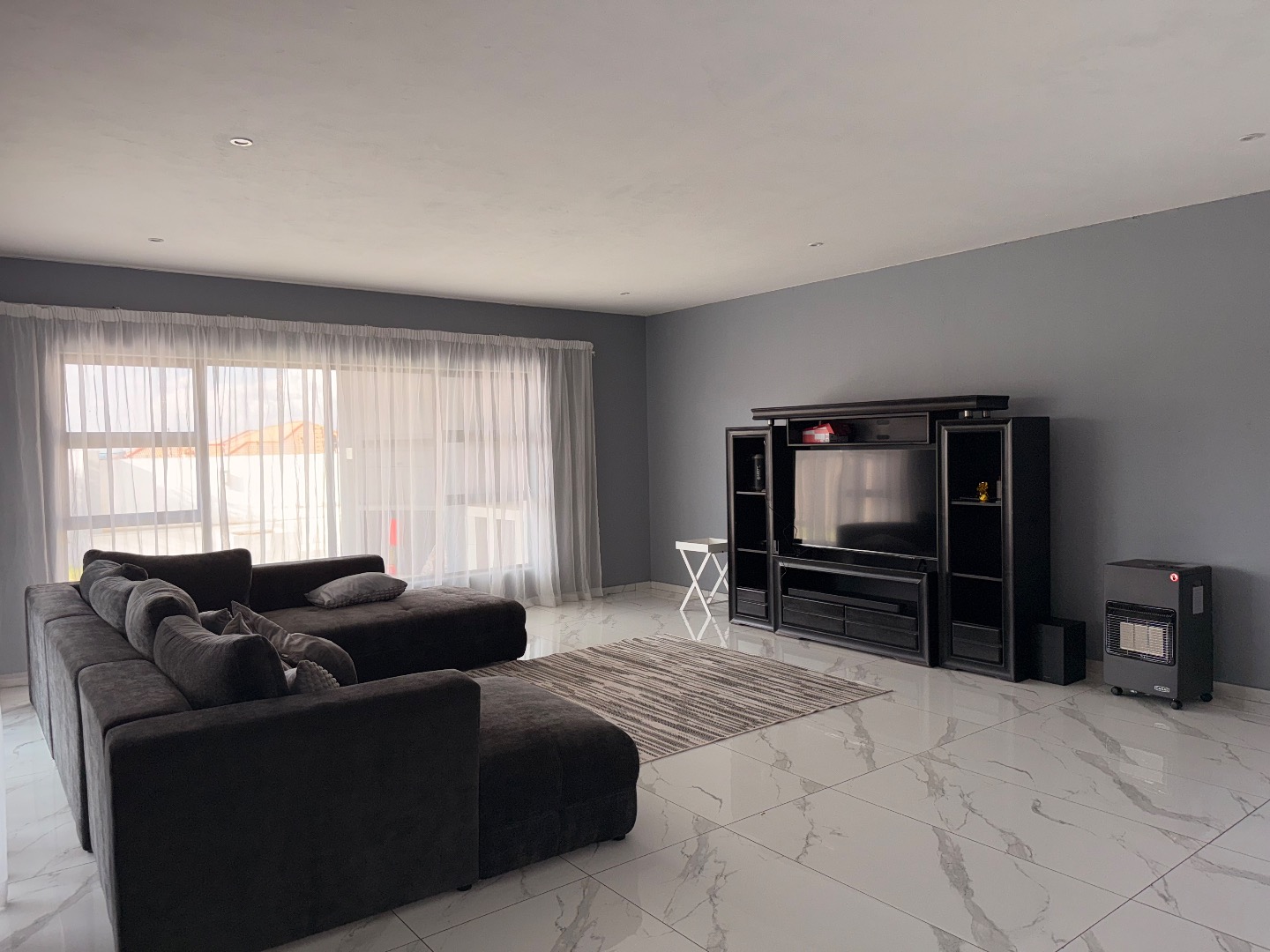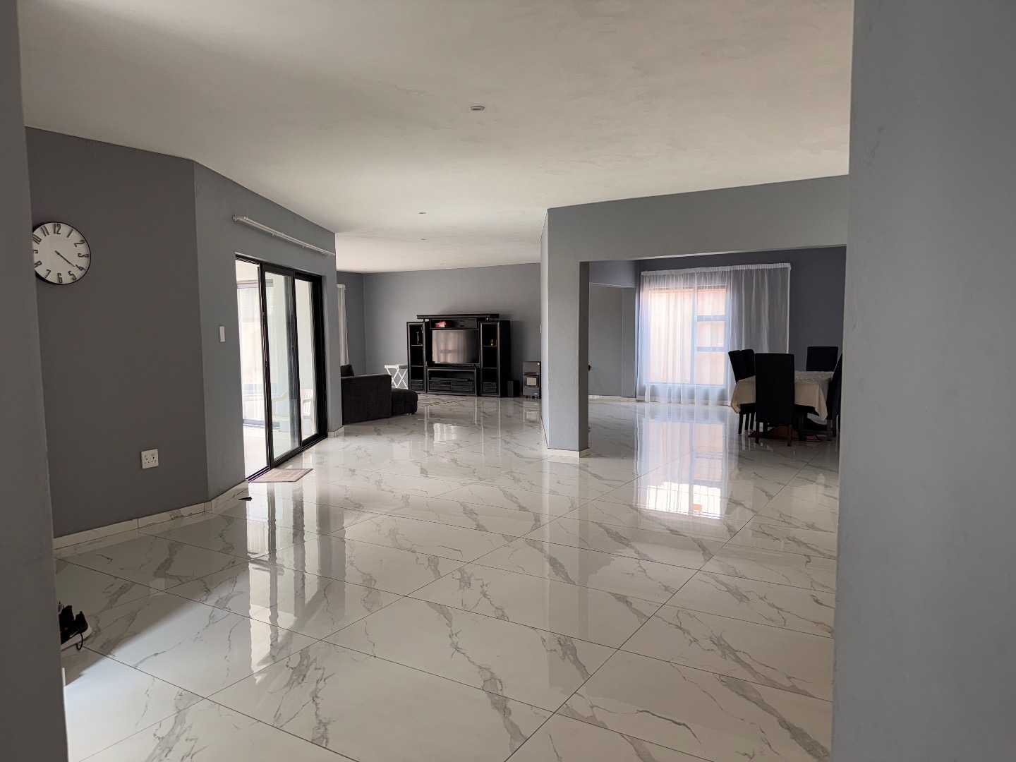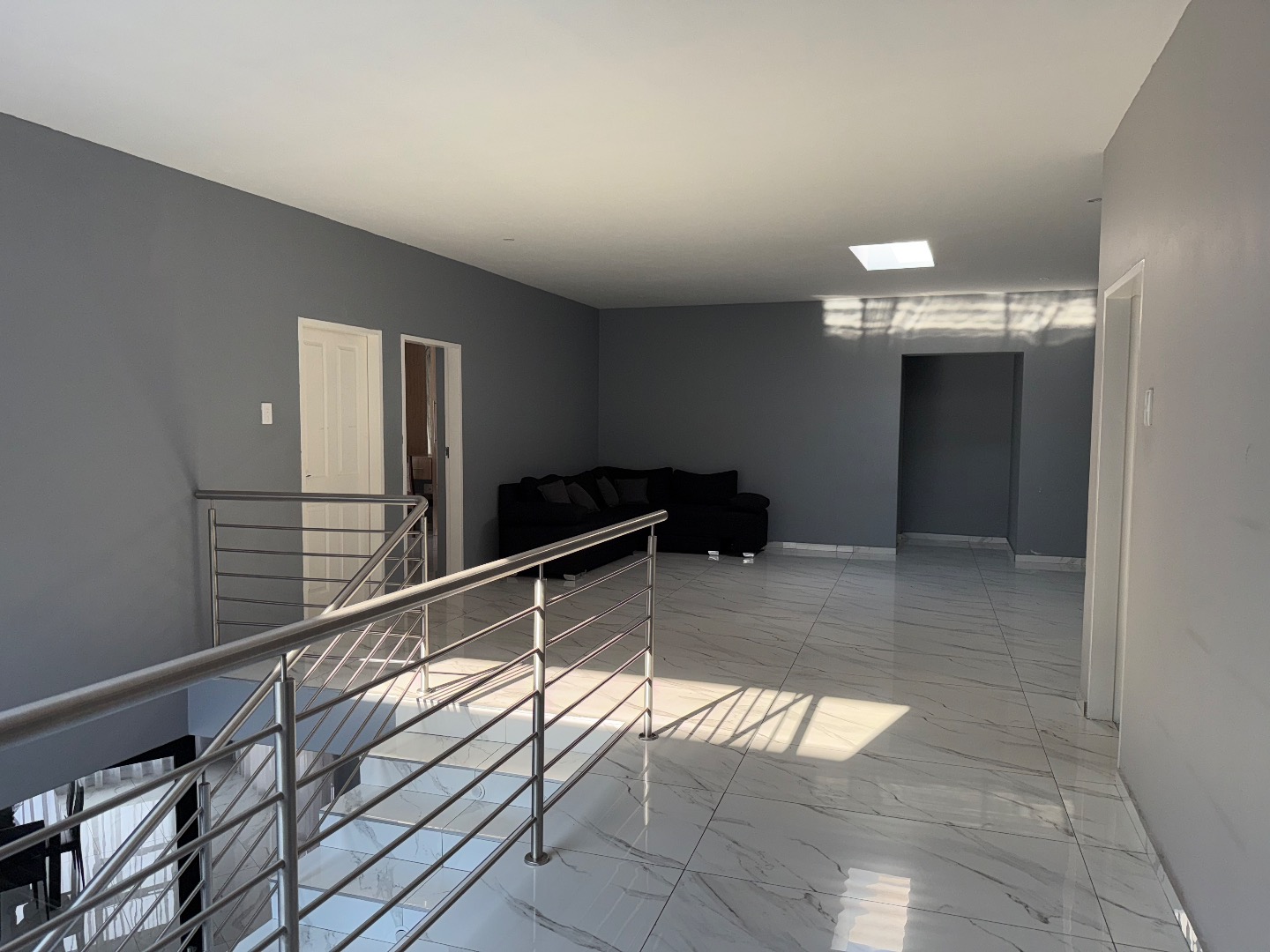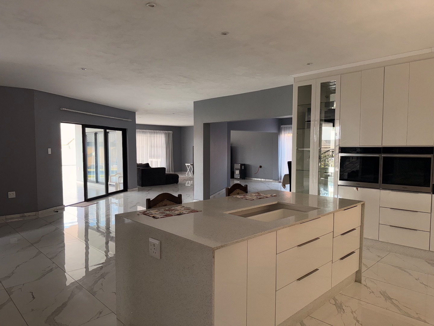 Discover this exceptional modern residence located in the desirable Model Park, Witbank, South Africa. Boasting a sleek grey exterior, contemporary flat roofs, and clean architectural lines, this property immediately impresses with its kerb appeal and expansive presence. Large windows and glass doors throughout ensure an abundance of natural light, creating a bright and inviting atmosphere. The interior spans a generous 724.00 sqm, offering an open-plan design that seamlessly connects multiple living spaces. The home features four distinct lounges, including a dedicated family TV room, alongside two elegant dining rooms and a well-appointed kitchen. High ceilings, modern large-format tile flooring, and a striking staircase with marble-look tiles and stainless steel railings underscore the property's sophisticated aesthetic. Comfort is paramount with seven spacious bedrooms, four of which are en-suite, providing private sanctuaries for all occupants. A convenient guest toilet and a dedicated laundry area further enhance the home's functionality, catering to the needs of a large family or those who enjoy hosting. Outdoor living is a highlight, set on a substantial 1447.00 sqm erf. The property features a private swimming pool, perfect for relaxation and entertainment. Multiple balconies offer elevated outdoor retreats, complementing the covered ground-floor patio equipped with a built-in braai and an additional tiled entertainment area with built-in seating and a fire pit. A well-maintained garden, paving, and a spacious driveway lead to three integrated garages, ensuring ample parking and storage. Security is comprehensively addressed with a perimeter fence, electric fencing, an access gate, and an alarm system, providing peace of mind. Modern conveniences include fibre connectivity and water tanks, ensuring a comfortable and connected lifestyle. Pets are welcome, making this a truly family-friendly home.