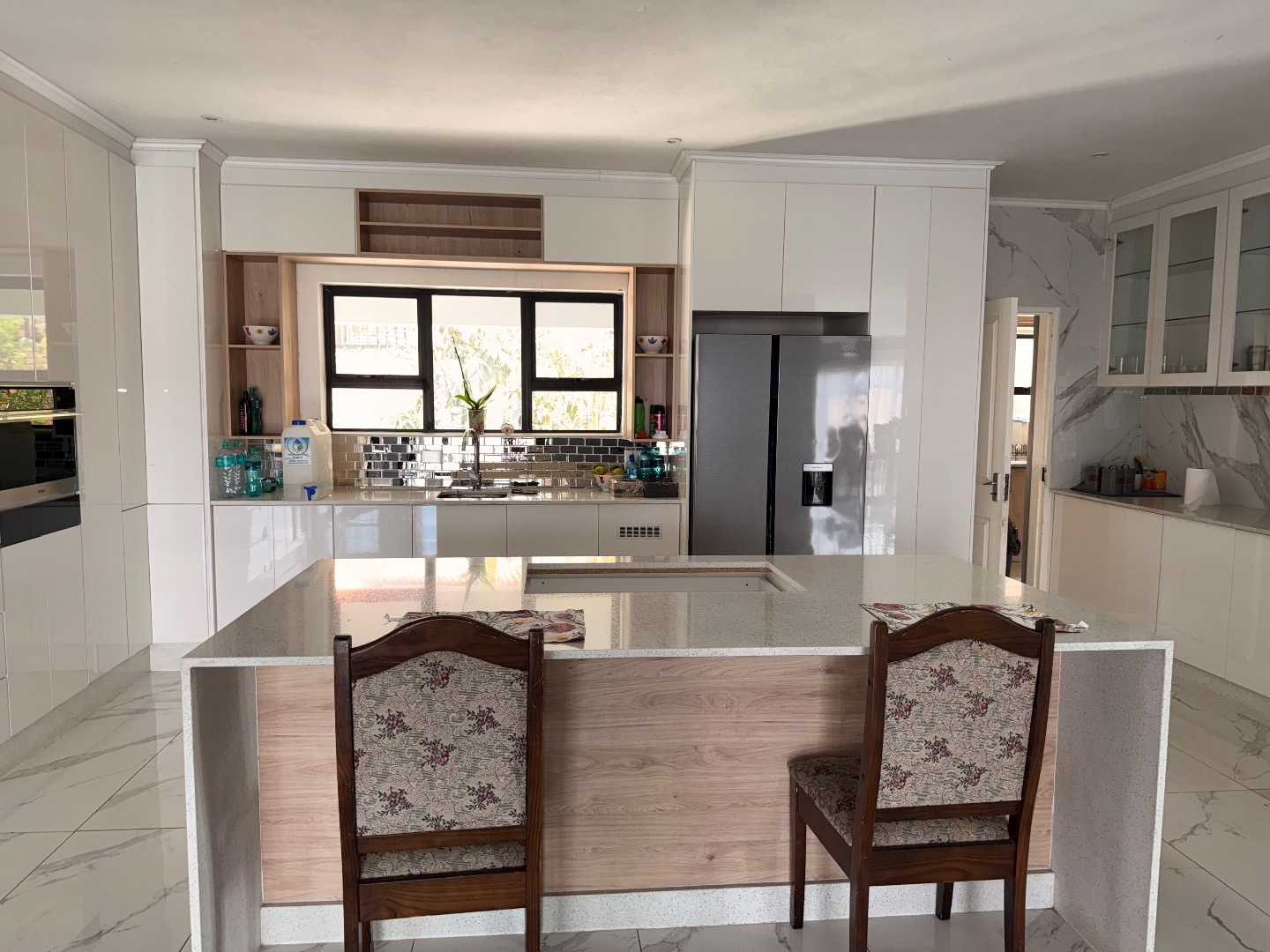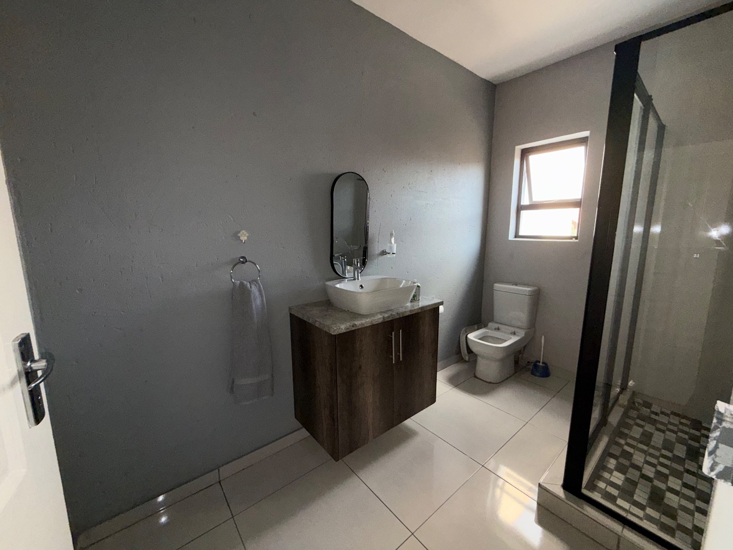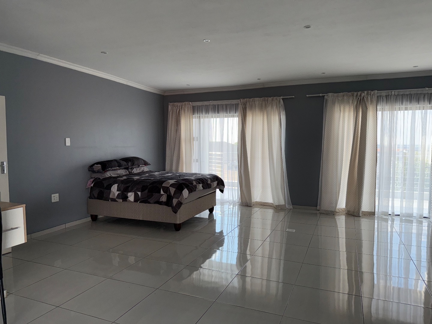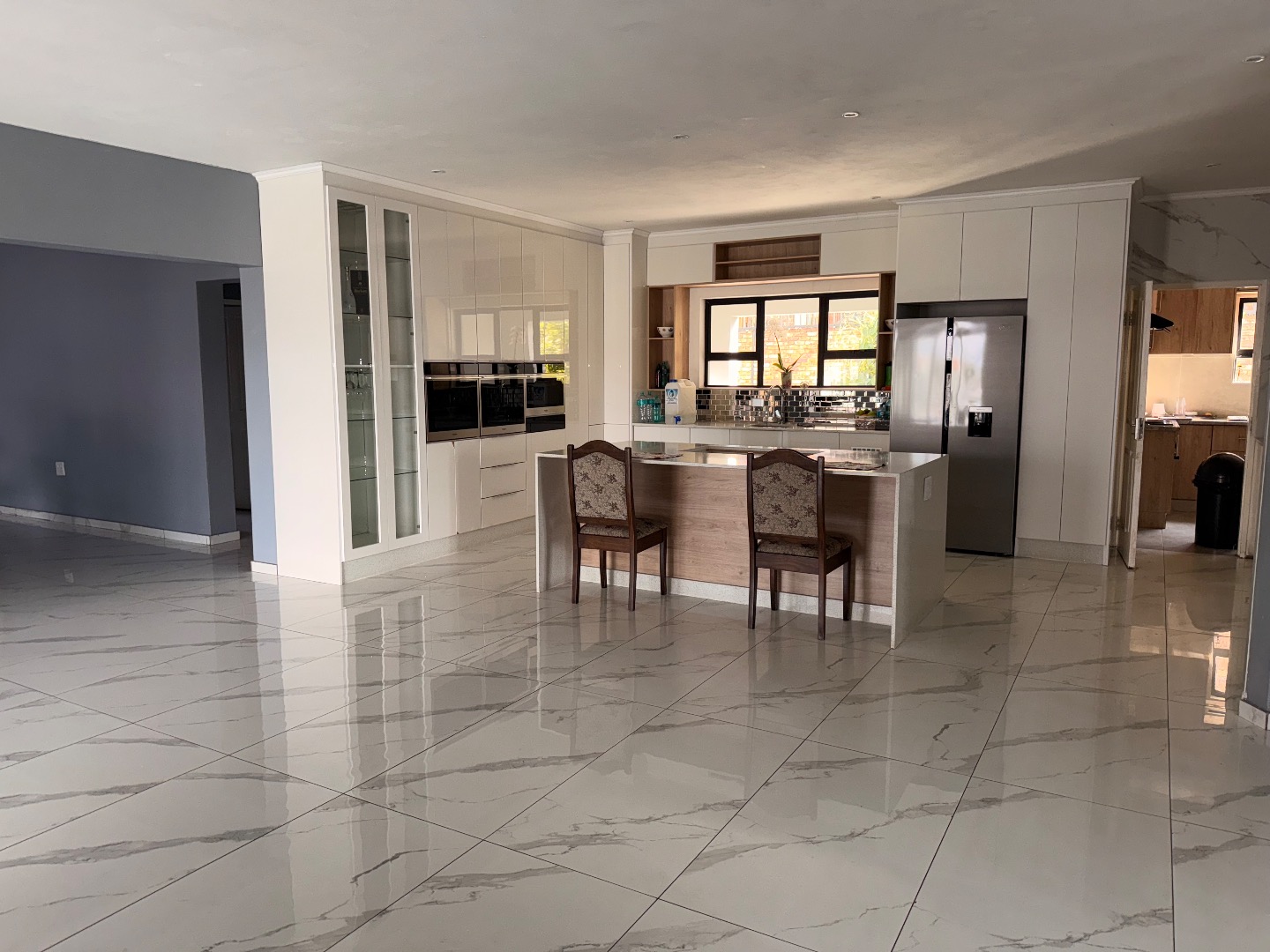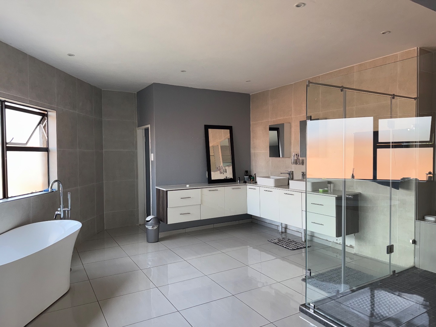 Discover this exceptional modern residence located in the desirable Model Park, Witbank, South Africa. Boasting a sleek grey exterior, contemporary flat roofs, and clean architectural lines, this property immediately impresses with its kerb appeal and expansive presence. Large windows and glass doors throughout ensure an abundance of natural light, creating a bright and inviting atmosphere. The interior spans a generous 724.00 sqm, offering an open-plan design that seamlessly connects multiple living spaces. The home features four distinct lounges, including a dedicated family TV room, alongside two elegant dining rooms and a well-appointed kitchen. High ceilings, modern large-format tile flooring, and a striking staircase with marble-look tiles and stainless steel railings underscore the property's sophisticated aesthetic. Comfort is paramount with seven spacious bedrooms, four of which are en-suite, providing private sanctuaries for all occupants. A convenient guest toilet and a dedicated laundry area further enhance the home's functionality, catering to the needs of a large family or those who enjoy hosting. Outdoor living is a highlight, set on a substantial 1447.00 sqm erf. The property features a private swimming pool, perfect for relaxation and entertainment. Multiple balconies offer elevated outdoor retreats, complementing the covered ground-floor patio equipped with a built-in braai and an additional tiled entertainment area with built-in seating and a fire pit. A well-maintained garden, paving, and a spacious driveway lead to three integrated garages, ensuring ample parking and storage. Security is comprehensively addressed with a perimeter fence, electric fencing, an access gate, and an alarm system, providing peace of mind. Modern conveniences include fibre connectivity and water tanks, ensuring a comfortable and connected lifestyle. Pets are welcome, making this a truly family-friendly home.