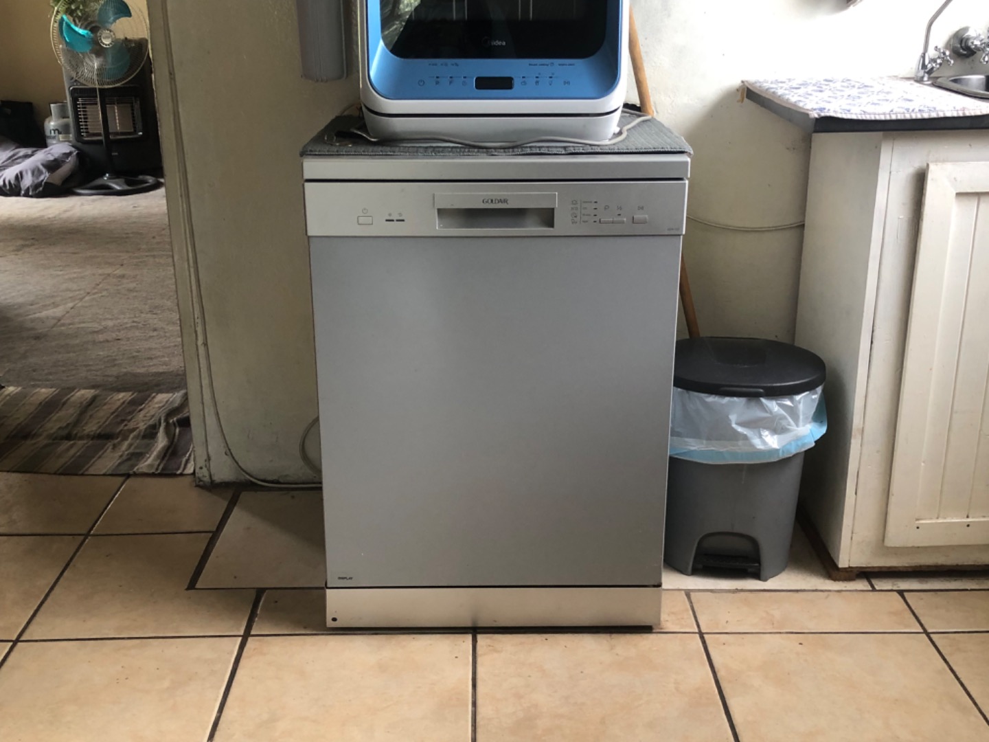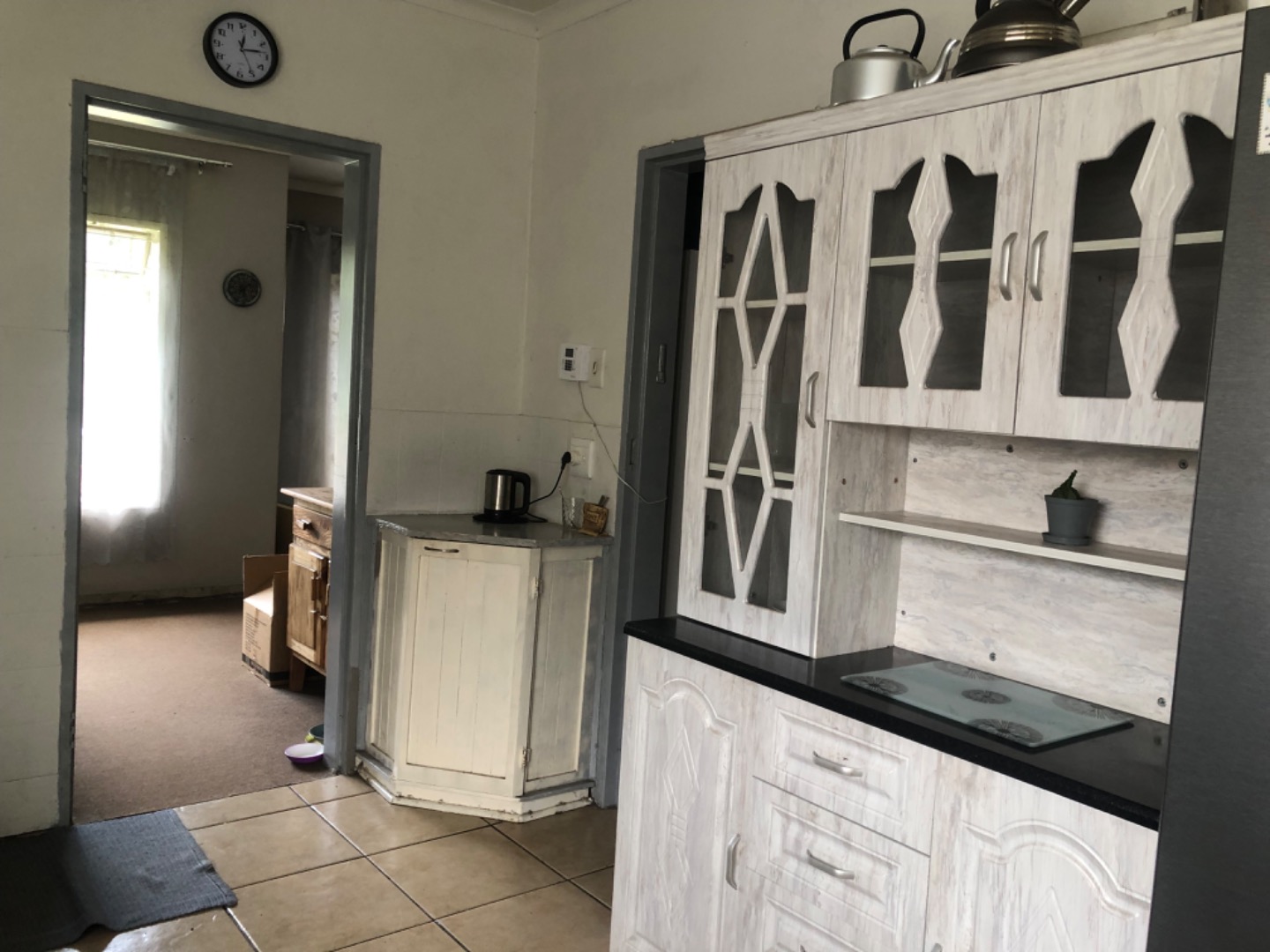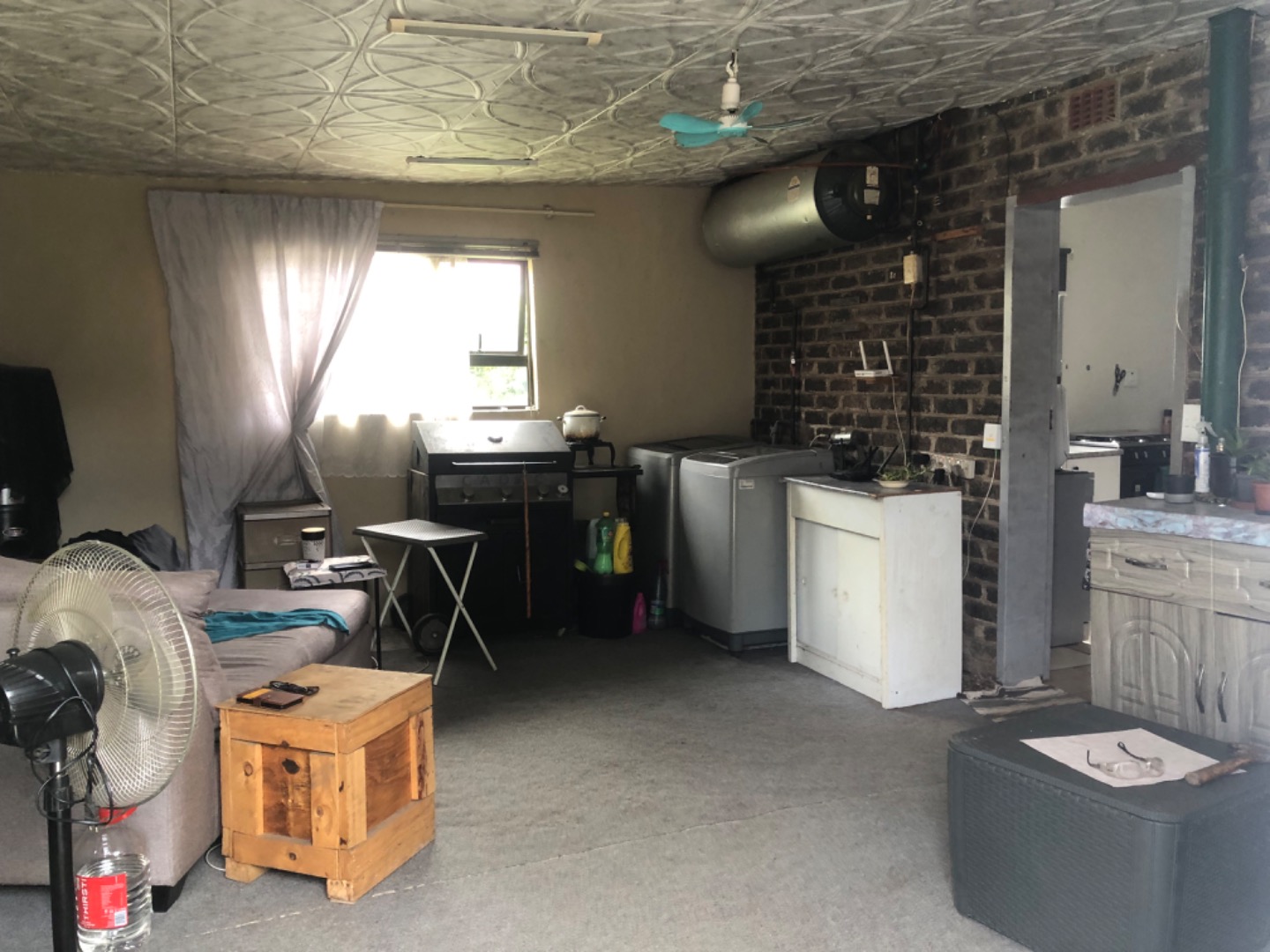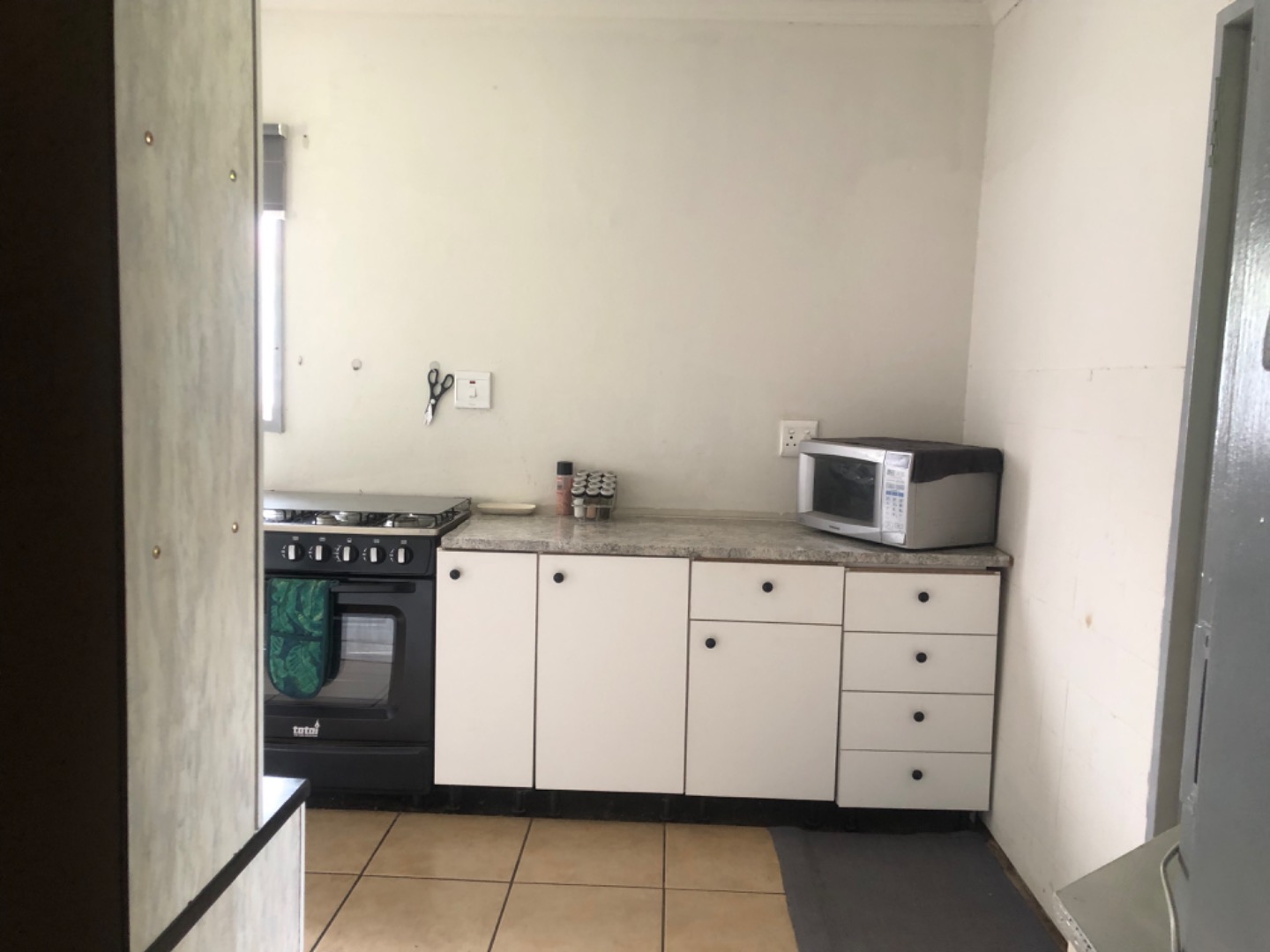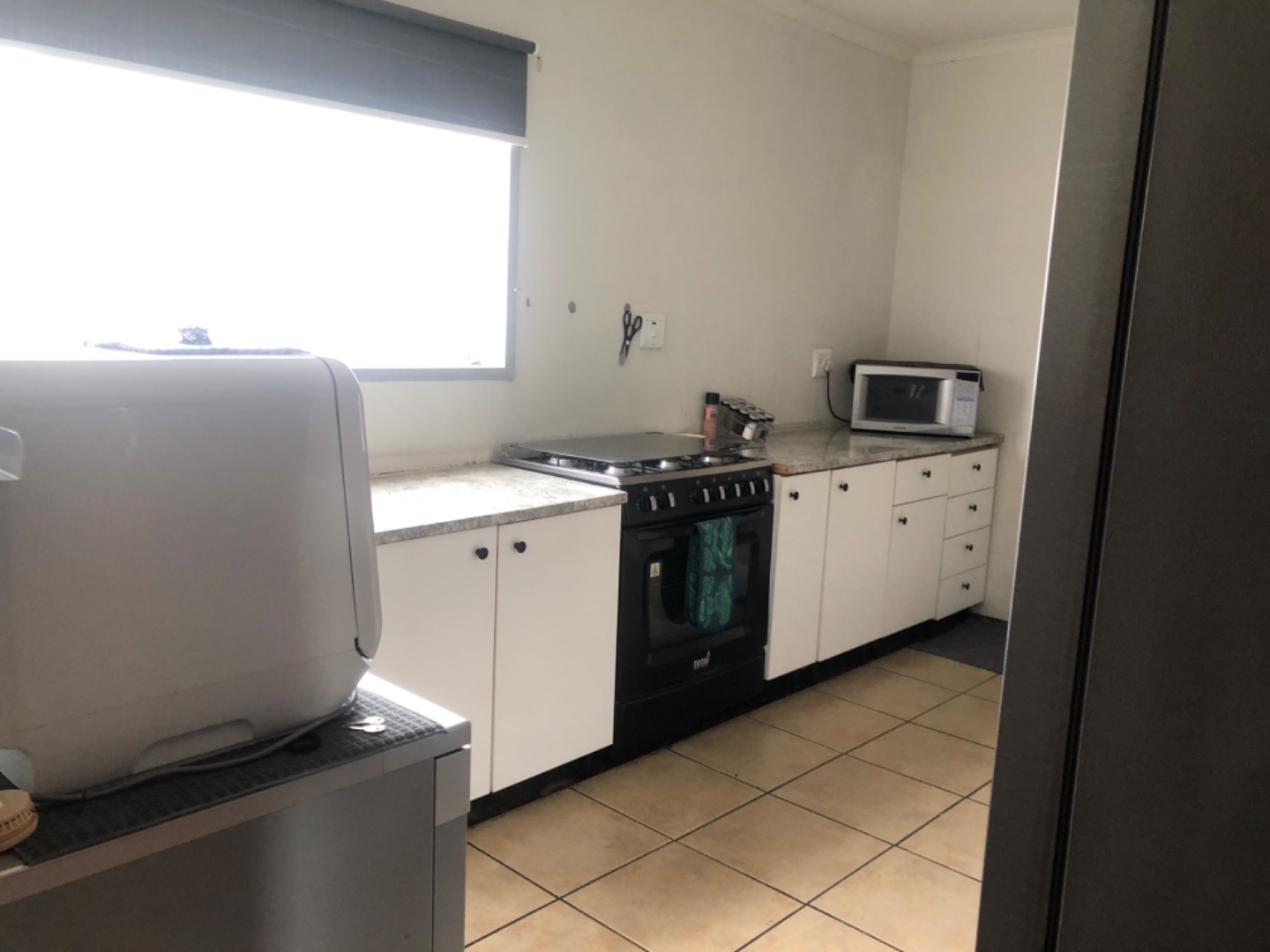 Inside, the functional layout includes a comfortable lounge and a well-equipped kitchen. The kitchen benefits from good natural light, tiled flooring, and granite-look countertops, complemented by white base cabinets. Essential appliances such as a stove, oven, microwave, and a modern freestanding dishwasher are included, making daily routines convenient. The home also features a versatile utility area, equipped with a washing machine, water heater, and internet connectivity, adding to its practical appeal.
